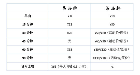 北京地區(qū)部分單曲收費8元,15分鐘收費20元、30分鐘38元、60分鐘58元。也有單曲收費為8元,分時段收費15分鐘為25元、28分鐘36元、38分鐘42元、48分鐘48元、58分鐘55元。